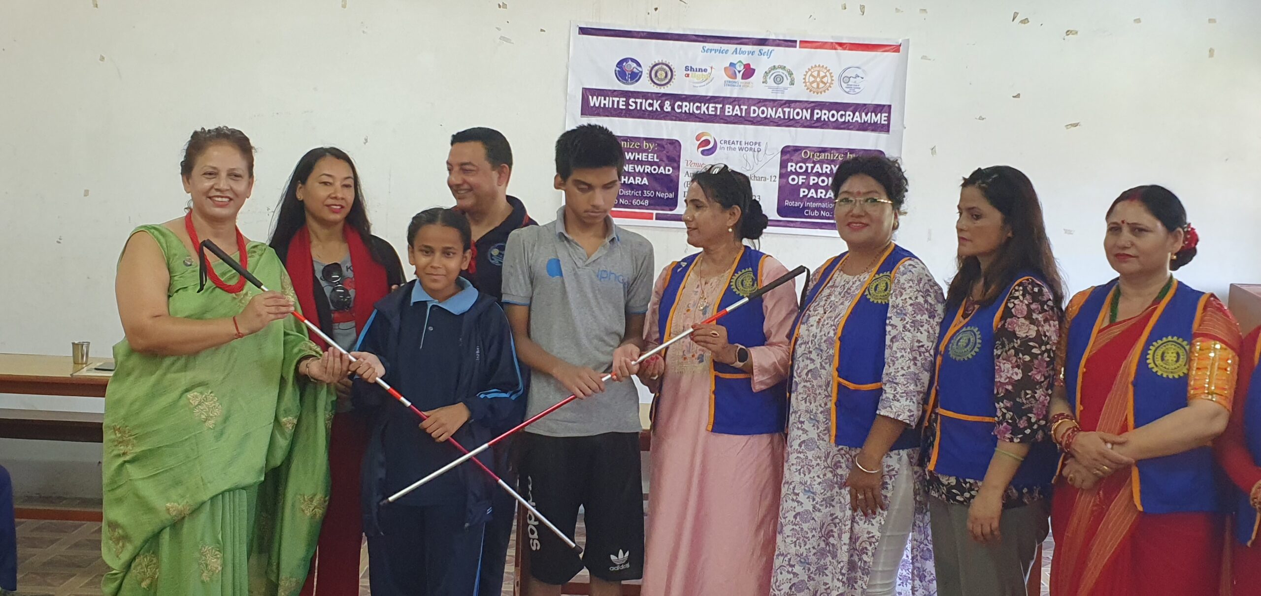White cane sticks, cricket bats, stums and balls were donated to the blind section students from Amarsingh School, Pokhara